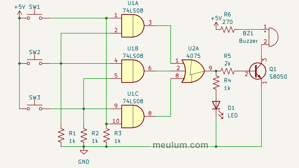 If any button pair is pressed, one of the inputs of the 74LS08 will be a logical 1, and the output will be a 1. The transistor will open, the buzzer will sound, and the LED will light.
