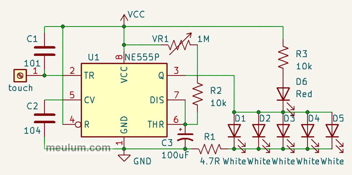 The touch of a finger on our sensor connects the capacitance and a human body inductance to pin 2 of the NE555 timer. The capacitor C1 protects this input from interference to prevent false positives.
