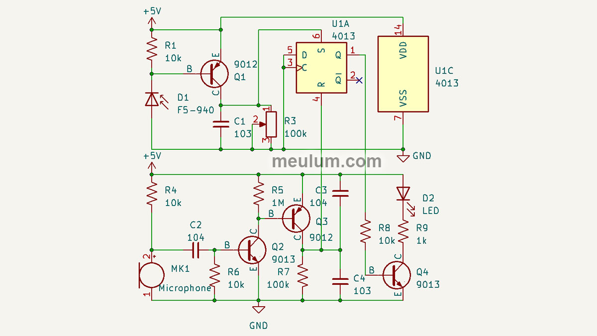 Remember we said that the CD4013 output current is enough for the LED? Here the LED is connected directly to the output of the chip.