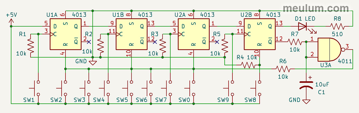 Buttons S2, S3, S5, S6, S0 reset triggers U1A, U1B and U2A. After pressing any of them, the code must be entered from the beginning. But they do not close the open lock because they do not affect the last trigger.